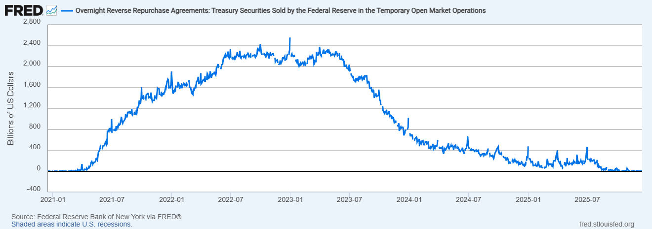 We have been talking about “Treasury QE” for over a year now. Since the market bottom in 2022, the Treasury first under Janet Yellen, then under Scott Bessent have been actively skewing supplying more bills to the market than usual. This created a huge boost to overall global liquidity. More bill issuance in general is liquidity-positive for markets, and was working well until the Reverse Repo Facility became empty over the past couple months.