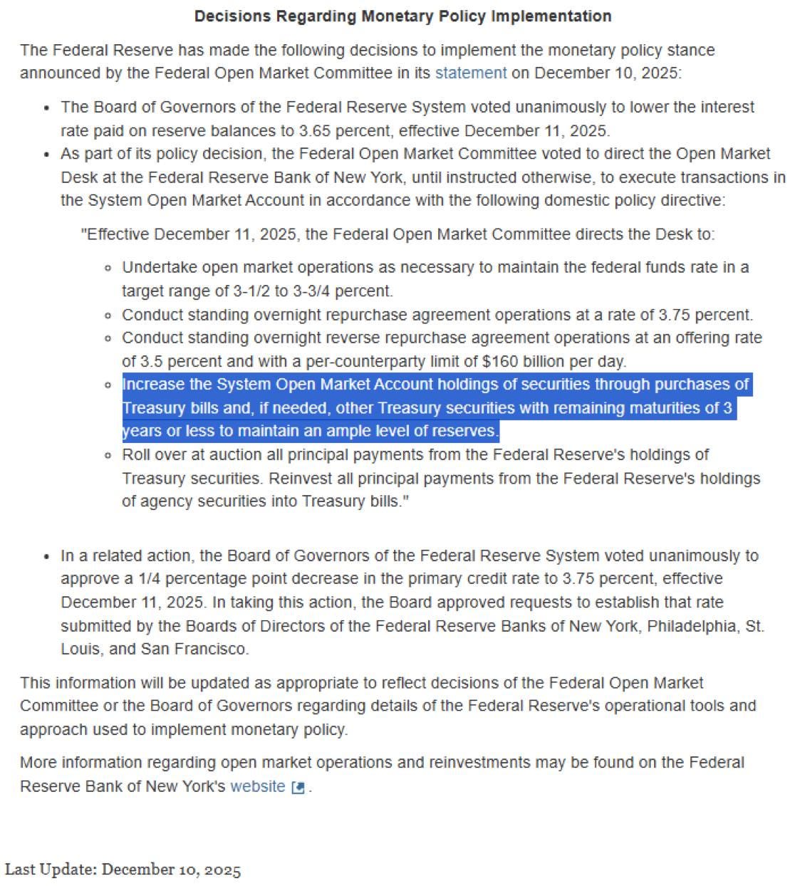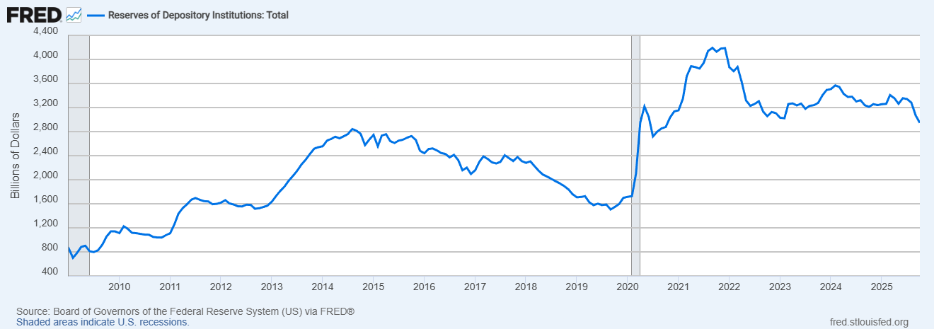 These actions are not intended to stimulate risk-taking or ease financial conditions broadly. They are instead designed to keep short-term funding markets functioning smoothly and to prevent small liquidity mismatches from cascading into systemic stress such as what occurred in 2019. This is also why the Fed never announces such measures during periods of obvious excess liquidity. Technical balance sheet expansion only appears when reserves are approaching the lowest comfortable level for banks and the margin for error in money markets becomes narrowed.