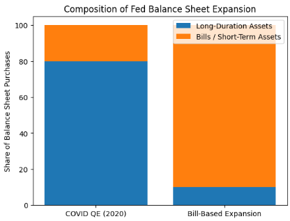 This distinction is directly relevant to today. The structure of the program, the choice of bills, and the stated intent are remarkably similar to what the Fed is now doing. In 2019, the bill purchase program did expand the balance sheet, but it did not function as QE in the traditional sense. It was only when COVID hit, that the Fed pivoted abruptly to “True QE”, launching massive purchases of longer-dated Treasuries and mortgage-backed securities totaling more than $3 trillion.