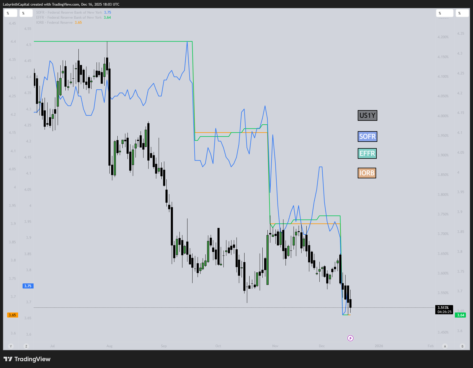 The program announced at the latest FOMC does none of this. By purchasing Treasury bills and short-dated securities out to three years, the Fed is acquiring assets that carry very little duration risk. Swapping bills for reserves is close to a duration-neutral operation. See below how Treasury bills yield roughly the policy rate (EFFR Green), while bank reserves created through these purchases earn interest on reserve balances (Orange) at the policy rate as well. From the perspective of dealers, there is no meaningful incentive to move out the curve. The impact on yields is therefore concentrated at the very front end, with little transmission to longer maturities or broader financial conditions.